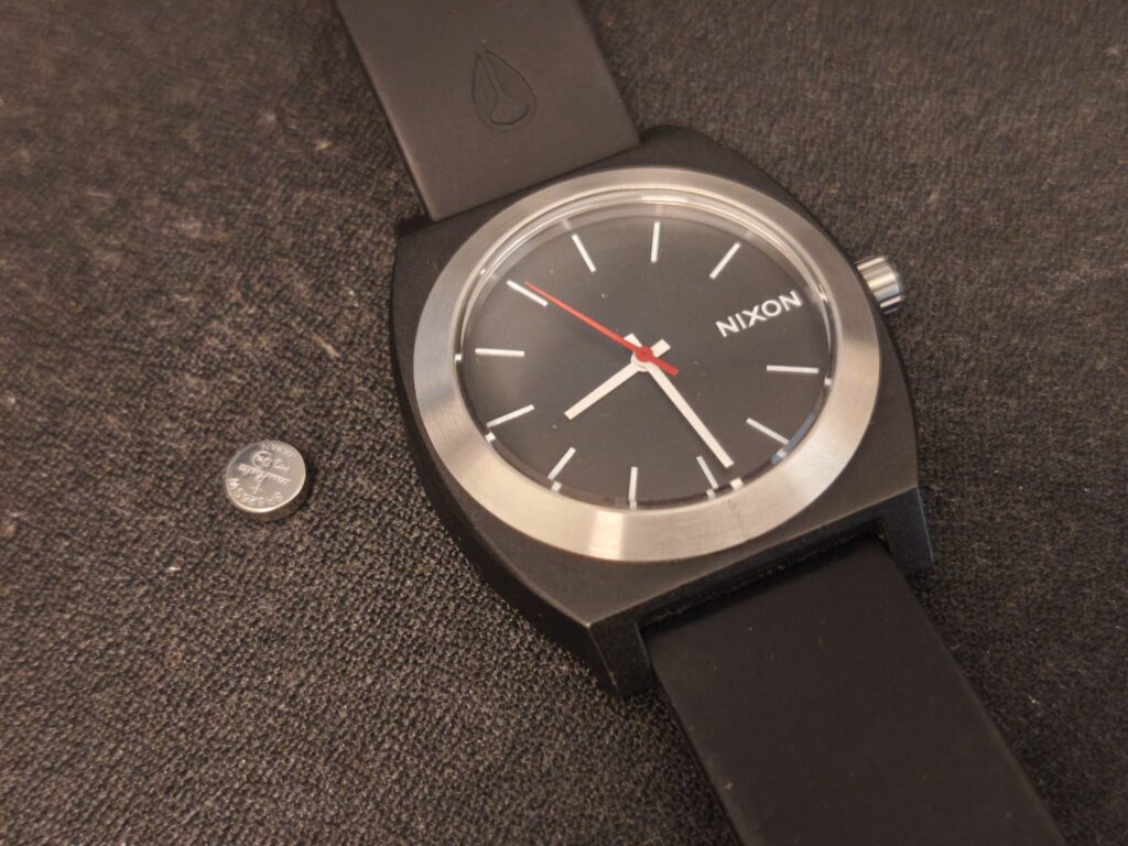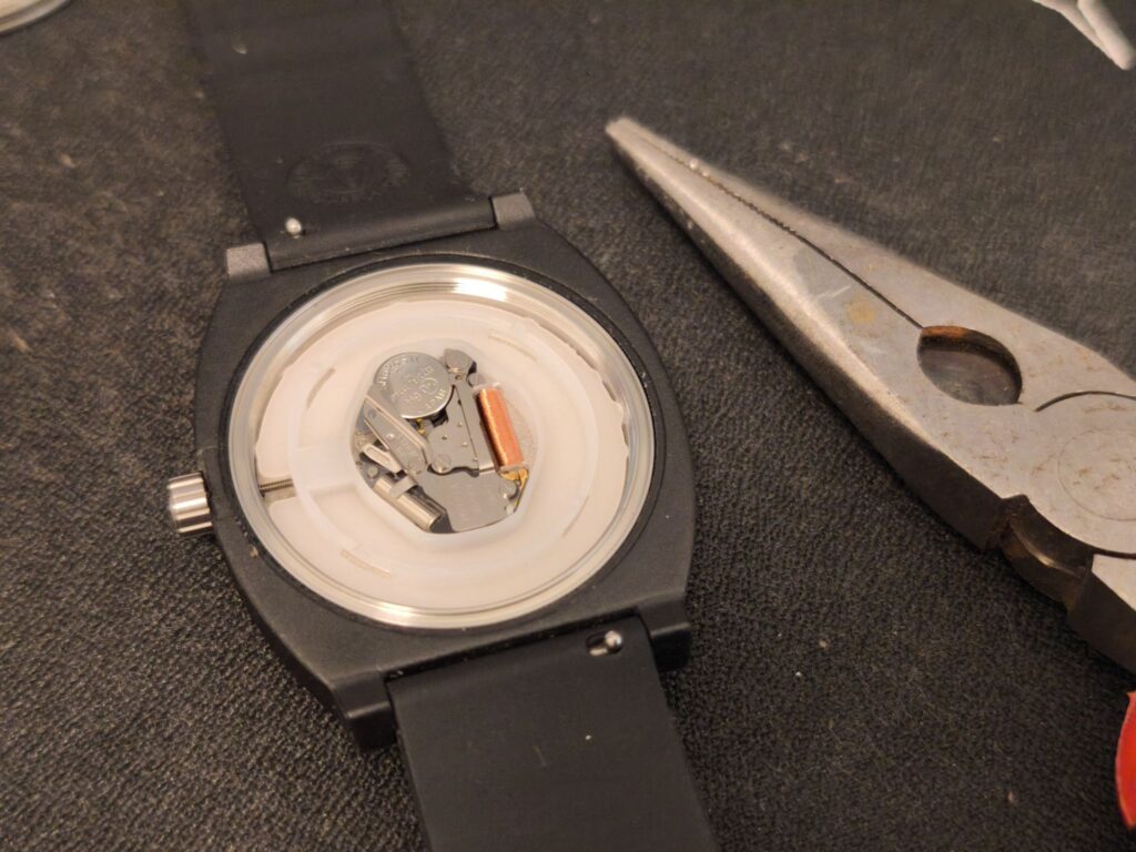 このNIXONの時計は裏蓋の端にコの字形の窪みが刻まれていて、そこへ専用の器具を差し込んで回すと開くんだとか。