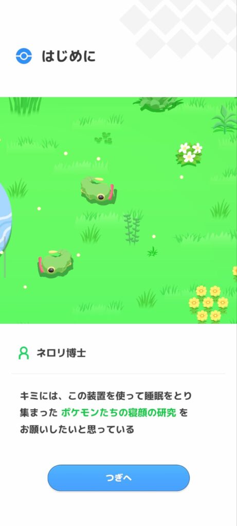 このゲームでは、ポケモン達の寝顔を研究している博士に協力するために、自分の睡眠データでもってポケモンの寝顔を集めるというのが目的。