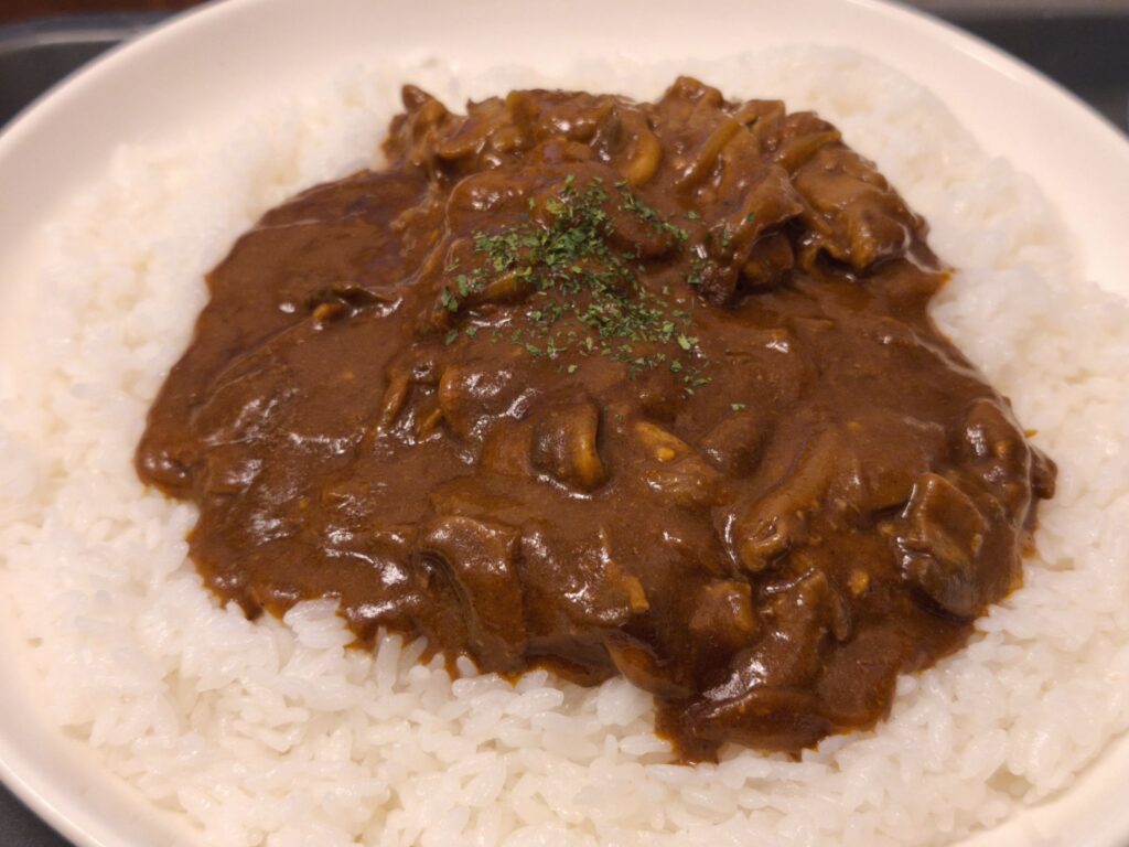こう、見た目がハヤシライスっぽいカレーって雰囲気だけじゃなく味も美味しいんですよねなぜか。